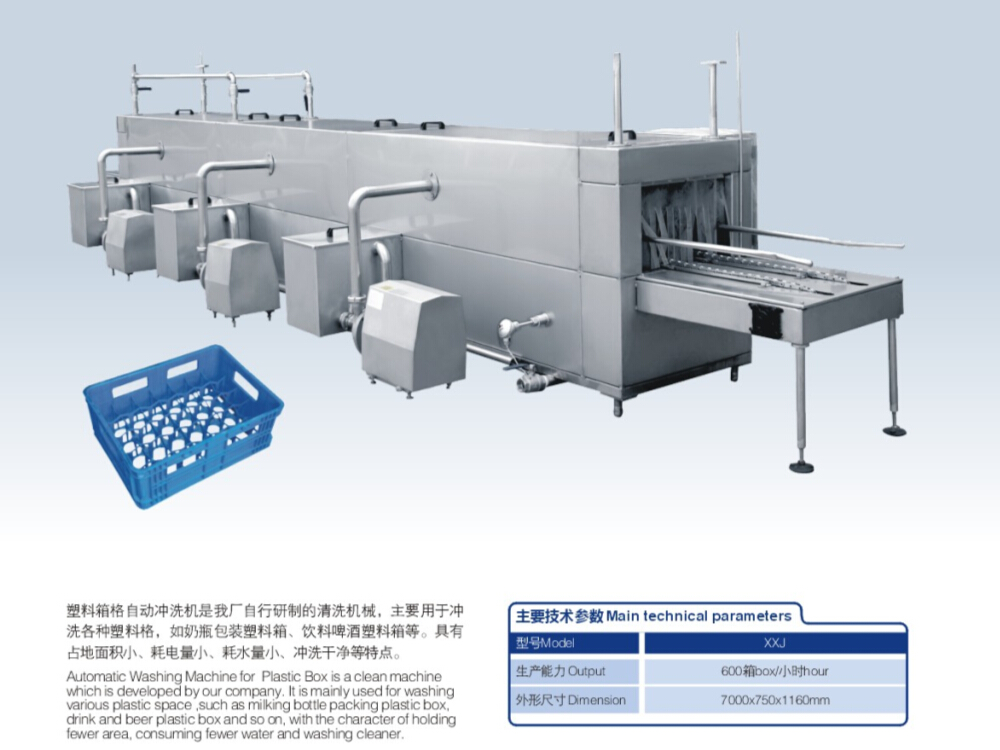 Automatic Washing Machine for  Plastic Box is a clean machine which is developed by our company. It is mainly used for washing various plastic space ,such as milking bottle packing plastic box, drink and beer plastic box and so on, with the character of holding fewer area, consuming fewer water and washing cleaner.